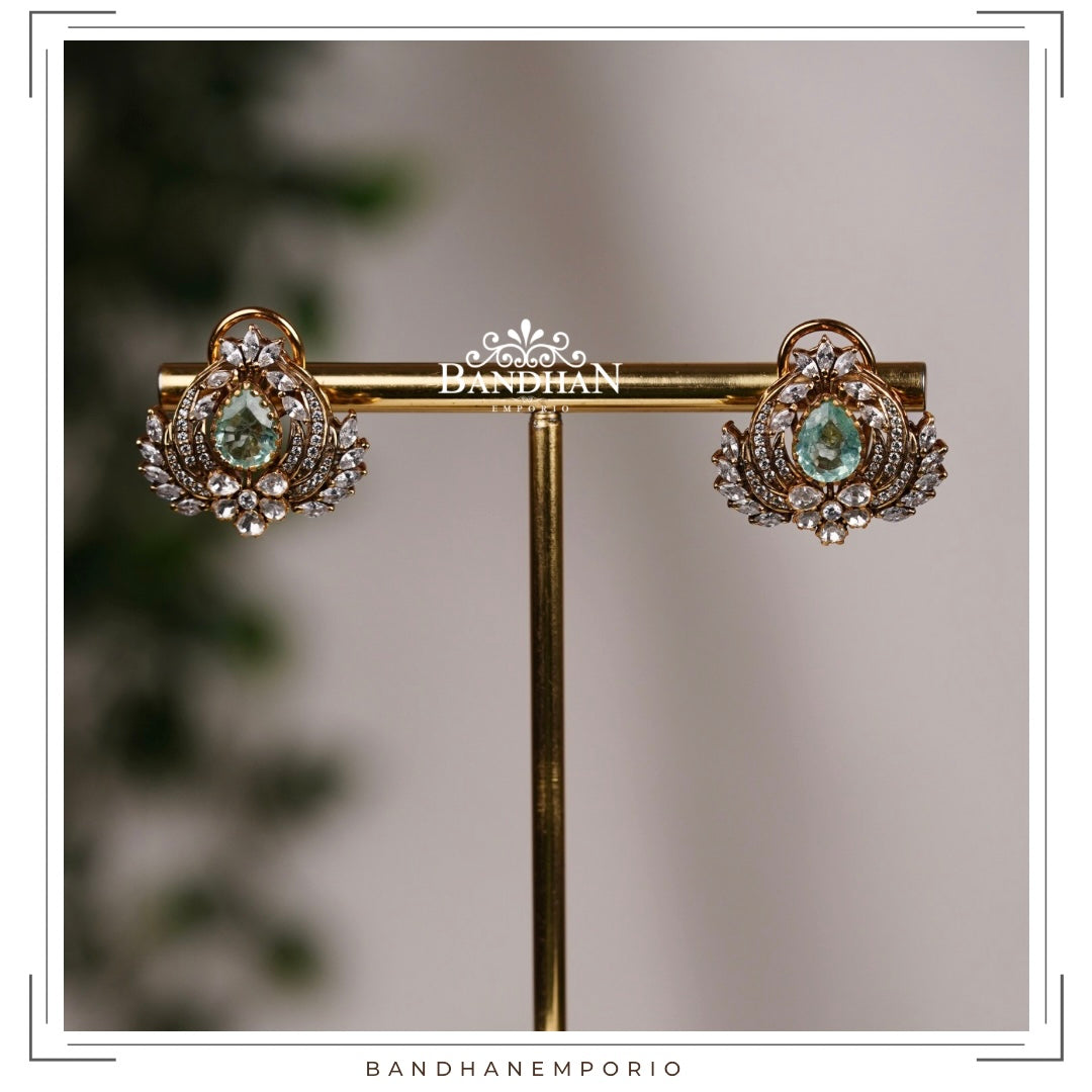 Intricate handcrafted light antique victorian studs, made in 92.5 Silver with 24 ct gold plating, studded with premium quality cubic zirconia stones and certified natural russian emerald. Product comes with 92.5 Silver Hallmark, screwback and supporting clip