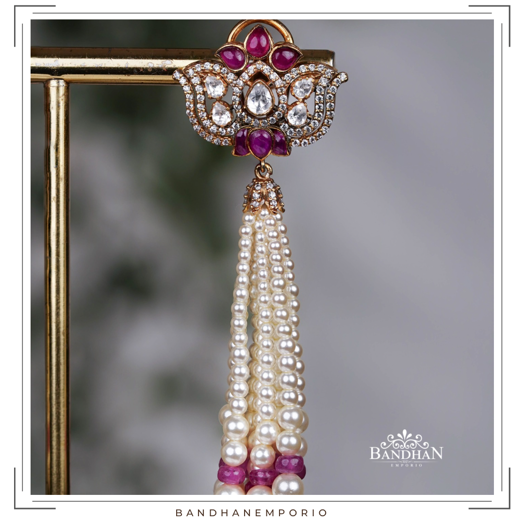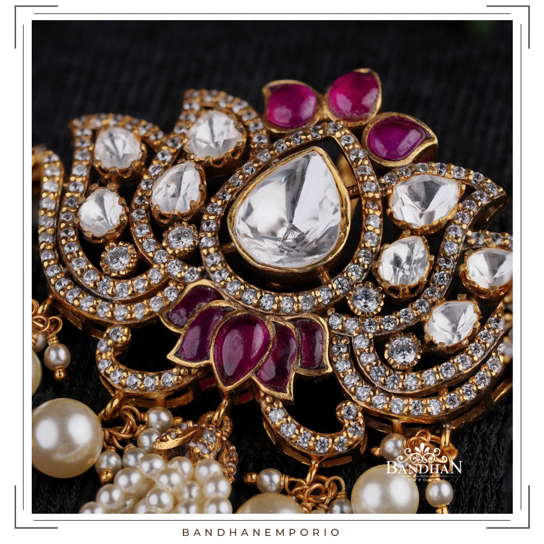 Handcrafted, detachable tassel Pendant set, 92.5 Silver Hallmarked, with 24ct gold plating, studded with premium quality cubic zirconia stones, synthetic polkis, precious fresh water pearls and precious rubies. Pendant is detachable.